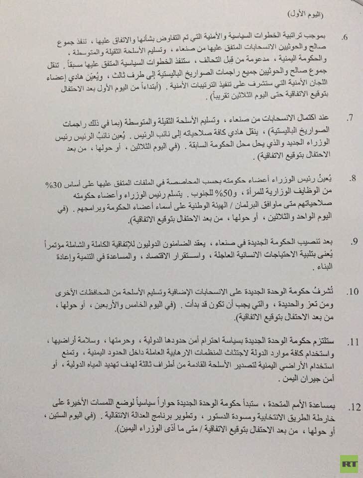 أولها يتعلق بالرئيس عبد ربه منصور هادي، الذي سيتم الاعتراف به رئيسا انتقاليا بسلطات محدودة، واختيار نائب جديد للرئيس بتوافق جميع الأطراف السياسية. والنقطة الثانية هي تشكيل لجنة عسكرية وأمنية عليا تتولى الإشراف على الانسحاب من المدنوتسلُّم الأسلحة الثقيلة. والنقطة الثالثة هي تشكيل حكومة وحدة وطنية بالمناصفة بين تحالف الشرعية وتحالف الحوثيين وحلفائهم، على أن يبدأ المسلحون الحوثيون وحلفاؤهم الانسحاب من المناطق المصنفة تحت الفئة "أ"، وهي – صنعاء وتعز والحديدة خلال شهرواحد على الأكثر.