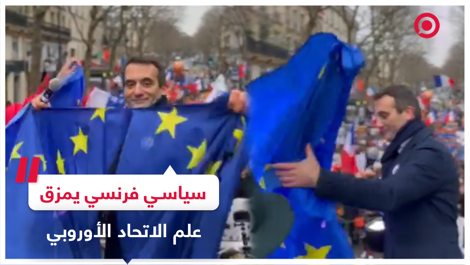 السياسي الفرنسي فلوريان فيليبو يمزق علم الاتحاد الأوروبي بمظاهرة في باريس