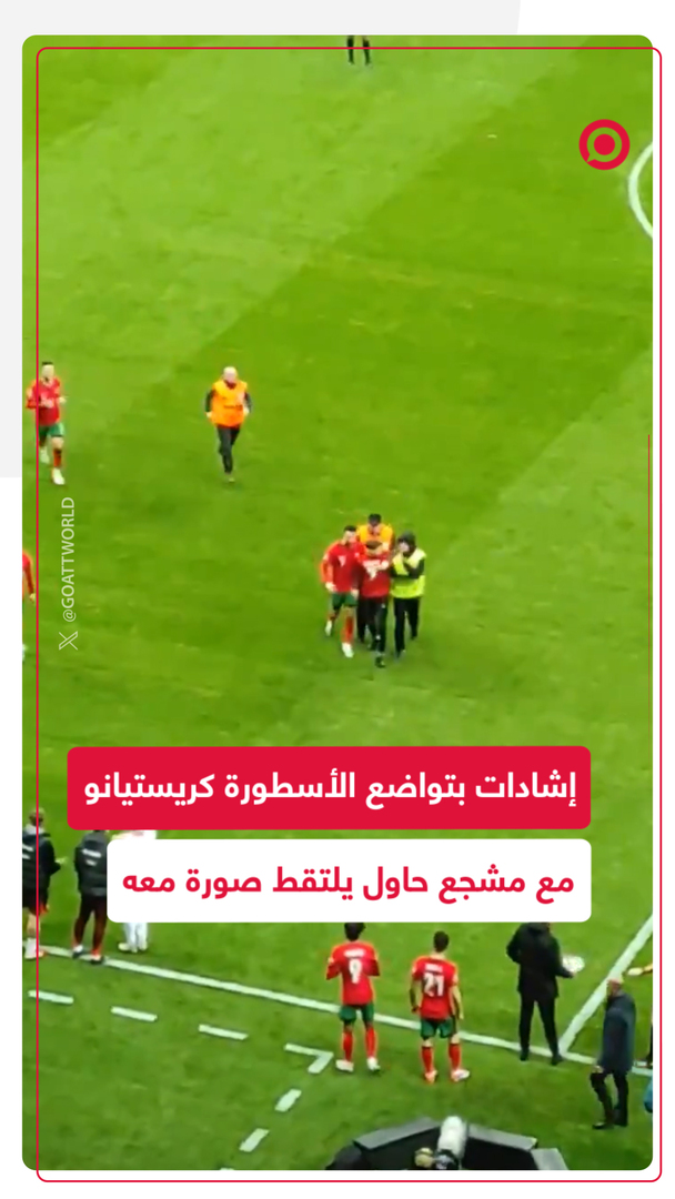البرتغالي كريستيانو رونالدو يمنع الأمن من ملاحقة مشجع نزل إلى أرض الملعب ليلتقط صورة معه، وذلك خلال مبارة البرتغال وبولندا في دوري أمم أوروبا.