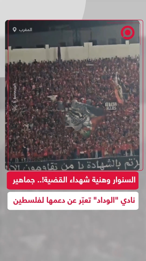 "السنوار وهنية شهداء القضية".. جماهير نادي "الوداد" الرياضي المغربي، تهتف دعما لفلسطين، وذلك خلال مباراة فريقهم على أرضية ملعب "العربي الزاولي" بمدينة الدار البيضاء بالمغرب.