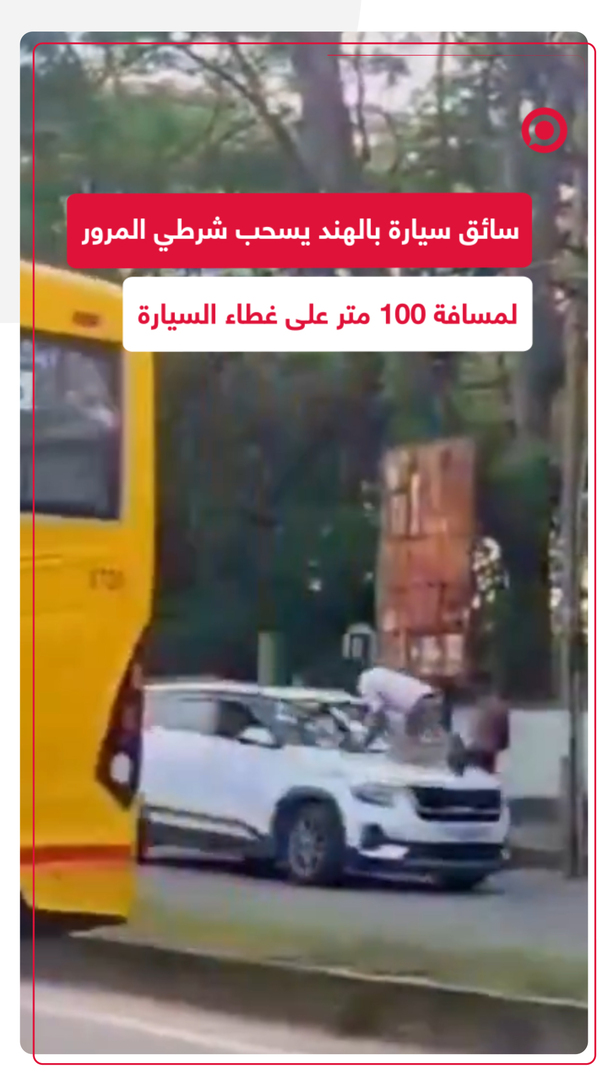 سائق سيارة دفع رباعي قام بسحب شرطي المرور لمسافة تقارب 100 متر على غطاء محرك السيارة في مدينة شيفاموجا الهندية.