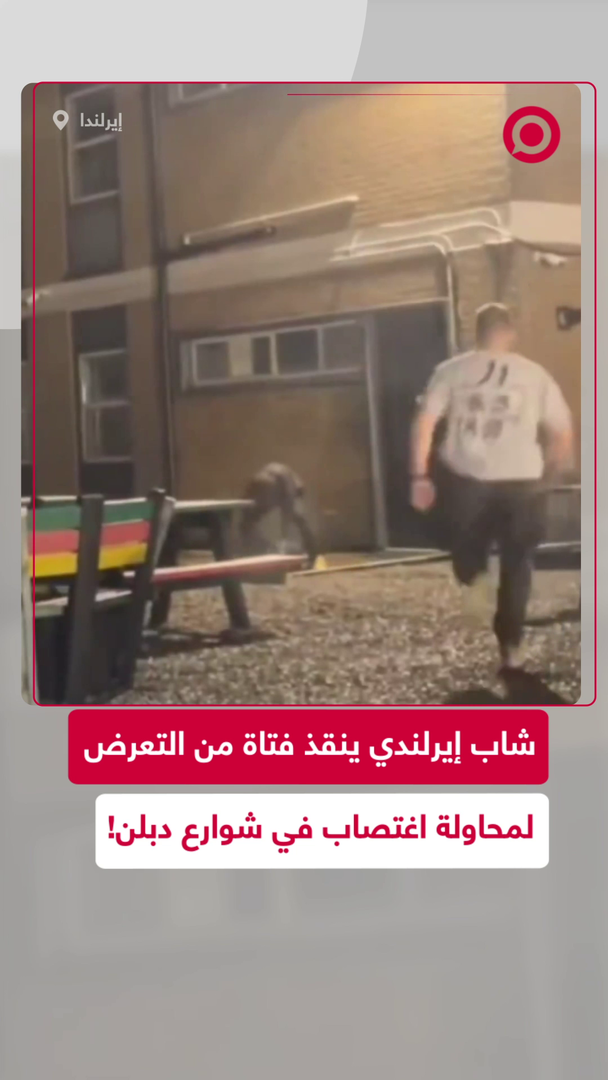 لقطات لرجل إيرلندي تمكن من منع محاولة اغتصاب فتاة في دبلن، حيث قام بإنقاذها بينما كانت تبكي طلبا للمساعدة أثناء تعرضها لهجوم من قبل شخص مجهول