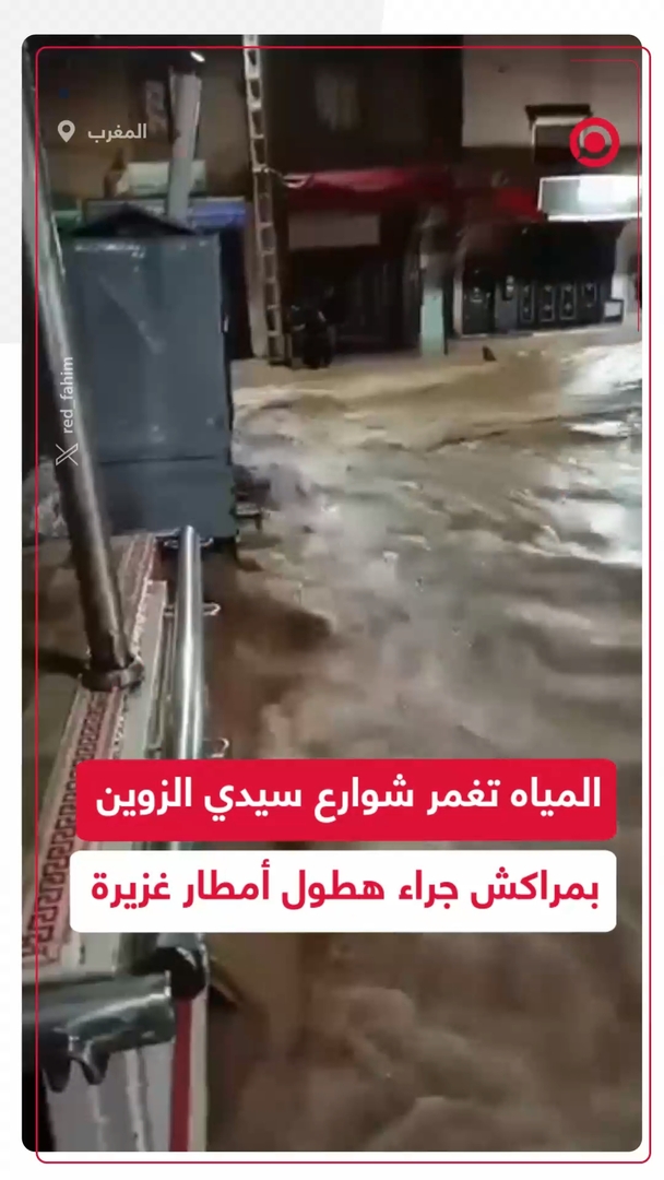 جراء التساقط الغزير للأمطار.. مشاهد توثق غرق شوارع مركز منطقة سيدي الزوين في مدينة مراكش المغربية، جراء سيول عارمة خلفتها مياه عاصفة اجتاحت البلاد.
