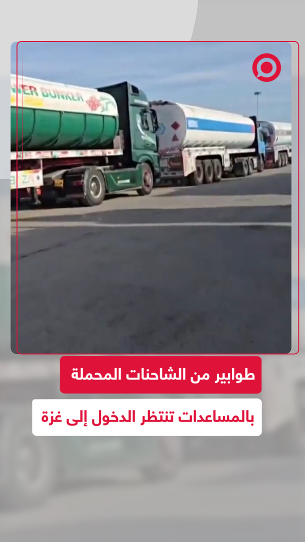 شاحنات تحمل مساعدات إنسانية تنتظر عند معبر رفح لدخول قطاع غزة. وبحسب منظمة "الأونروا" وصل عدد الشاحنات إلى 4 آلاف شاحنة محملة بالمساعدات نصفها من الغذاء والدقيق.