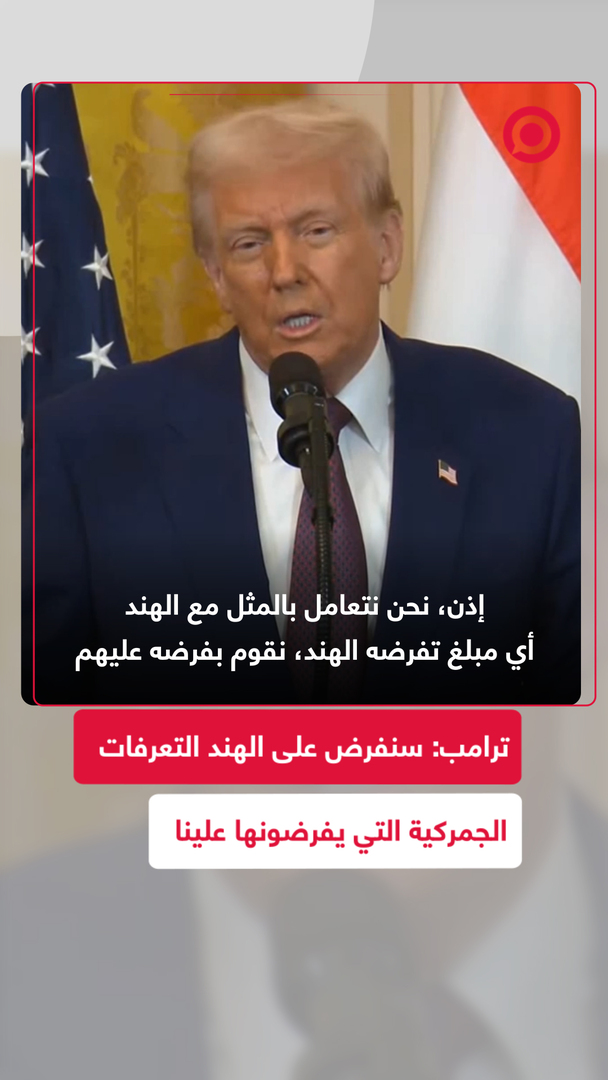 "أي مبلغ تفرضه الهند، سنقوم بفرضه عليهم".. الرئيس الأمريكي دونالد ترامب يشير إلى التعرفات الجمركية الهندية المرتفعة على الولايات المتحدة والطريقة التي سيتعامل بها مع هذا الوضع.