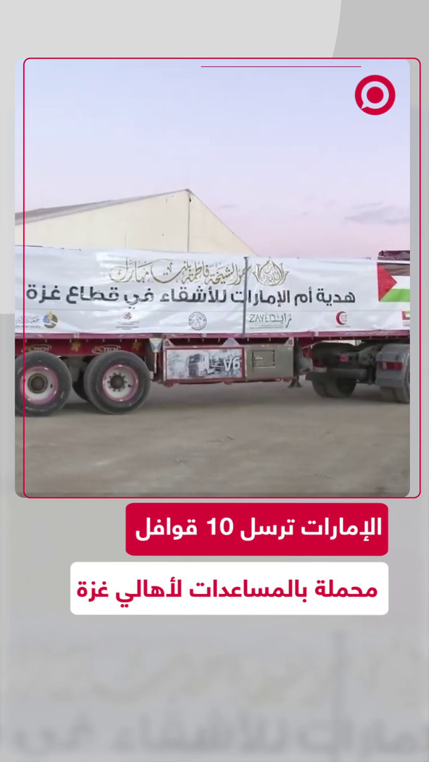 وصول 10 قوافل من المساعدات الإنسانية من الإمارات إلى القطاع عبر معبر رفح. وتشمل القوافل 175 شاحنة محملة بأكثر من 2400 طن من المستلزمات الغذائية والطبية والعديد من الحاجات الأساسية.