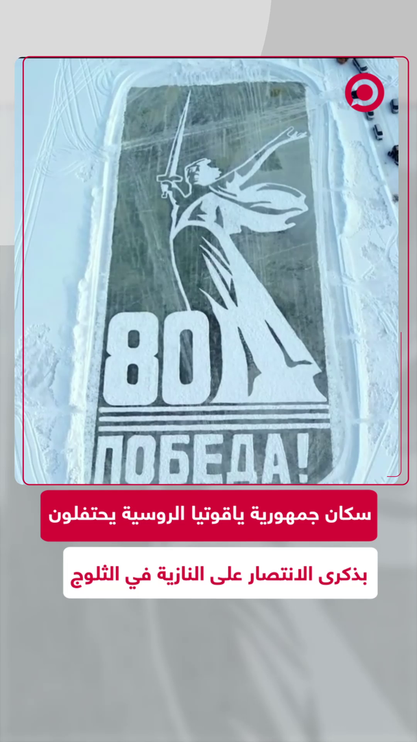 سكان جمهورية ياقوتيا الروسية يقومون برسم لوحة عملاقة على الثلج احتفالا بالذكرى الثمانين للنصر في الحرب العالمية الثانية، حيث بلغت مساحة اللوحة أكثر من 7200 متر مربع وقام أكثر من 130 متطوع بالمشاركة في إنشائها.