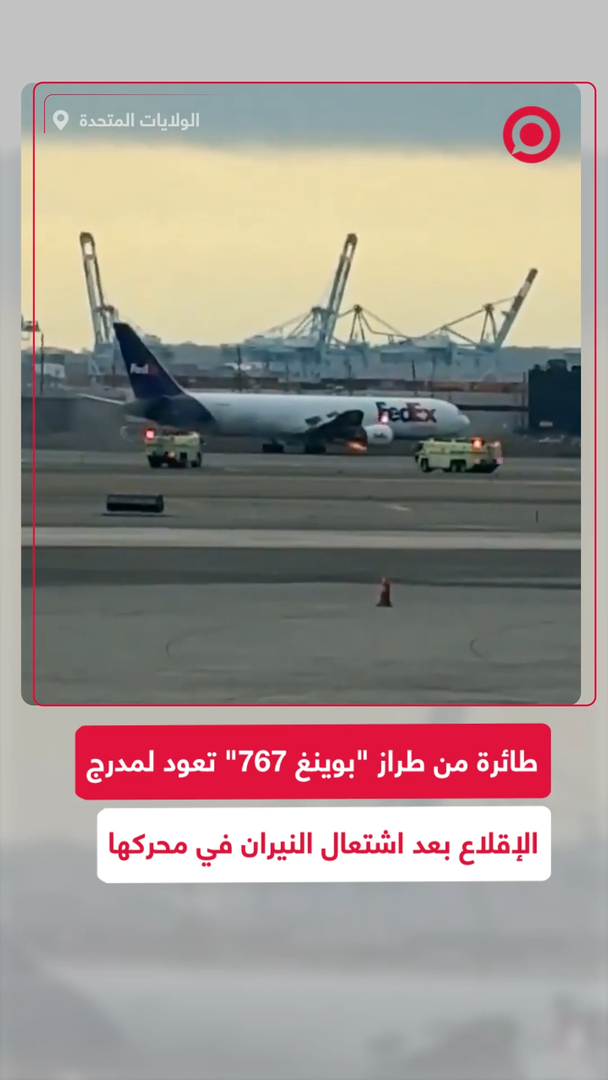 هبطت طائرة تابعة لشركة البريد السريع الأمريكية "فيديكس" من طراز "بوينغ 767" اضطراريا في مطار نيوارك ليبرتي الأمريكي في ولاية نيوجيرسي، بسبب حريق في أحد محركاتها