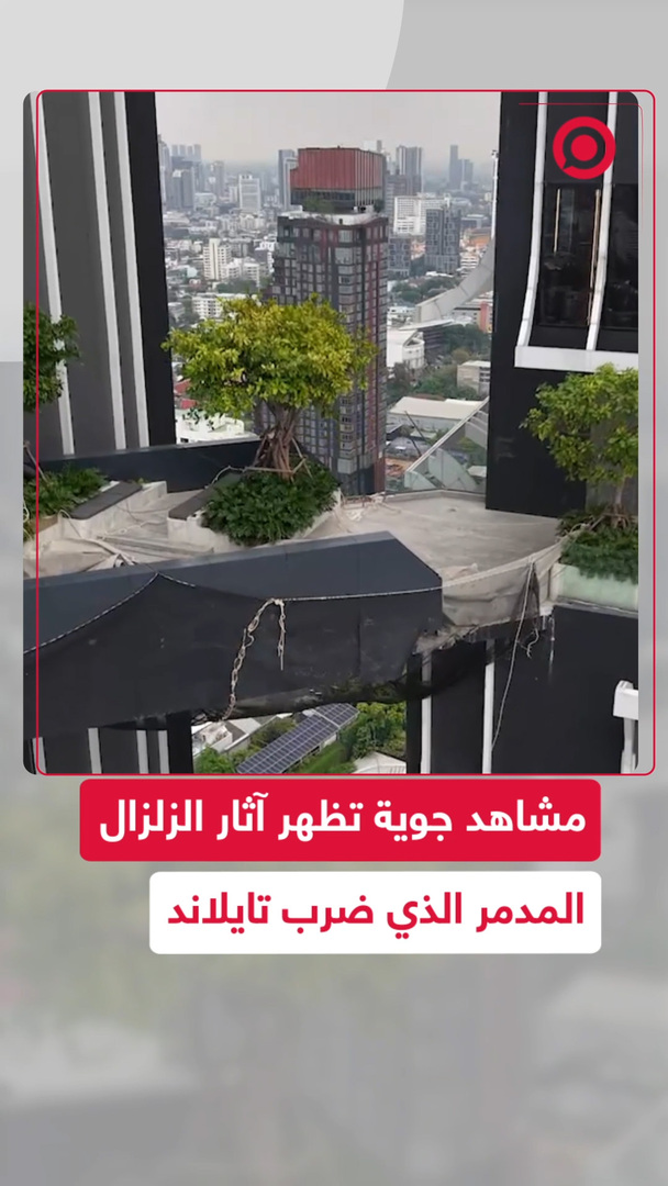 تايلاند.. مشاهد جديدة لآثار الزلزال المدمر الذي أصاب البلاد، تم التقاطها من طائرة مسيرة في العاصمة بانكوك، تظهر الدمار الذي حل بأحد مباني المدينة إضافة إلى تضرر مباني شاهقة متصلة بجسور.