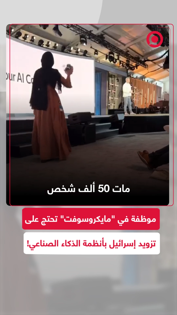 الموظفة في شركة "مايكروسوفت" ابتهال أبو السعد، تقاطع كلمة الرئيس التنفيذي لـ"مايكروسوفت للذكاء الاصطناعي" مصطفى سليمان. وذلك خلال الاحتفال بالذكرى الخمسين لتأسيس الشركة احتجاجا على توفير أنظمة الذكاء الاصطناعي للجيش الإسرائيلي في الحرب التي يشنها على قطاع غزة.