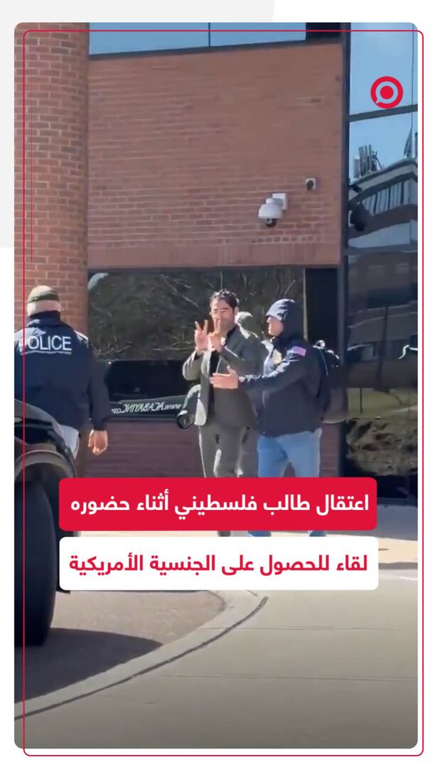 أثناء حضوره لقاء للحصول على الجنسية الأمريكية.. سلطات الهجرة بالولايات المتحدة تعتقل الطالب الفلسطيني في جامعة كولومبيا محسن مهداوي، وذلك بسبب نشاطه في الجامعة المناهض للحرب الإسرائيلية على قطاع غزة.