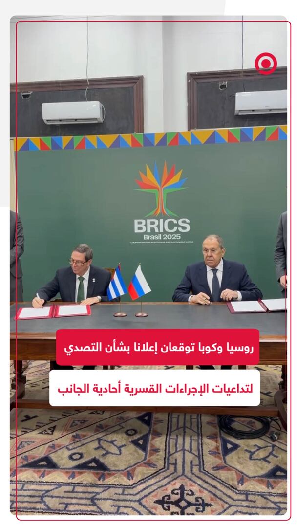 على هامش اجتماع وزراء خارجية دول "بريكس" بالبرازيل.. وزيرا خارجية روسيا وكوبا يوقعان إعلانا مشتركا بشأن التصدي لتداعيات الإجراءات القسرية أحادية الجانب.