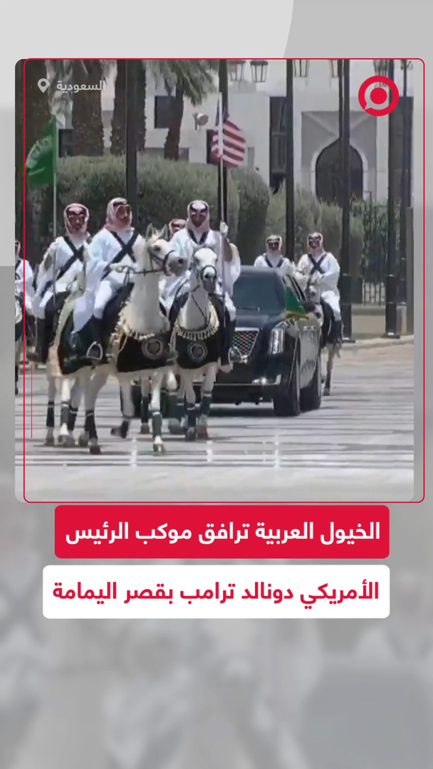 مشاهد لقيام الخيول العربية بمرافقة موكب الرئيس الأمريكي دونالد ترامب، حتى باب الديوان الملكي بقصر اليمامة بالعاصمة الرياض، حيث كان ولي العهد السعودي، الأمير محمد بن سلمان، في استقباله.