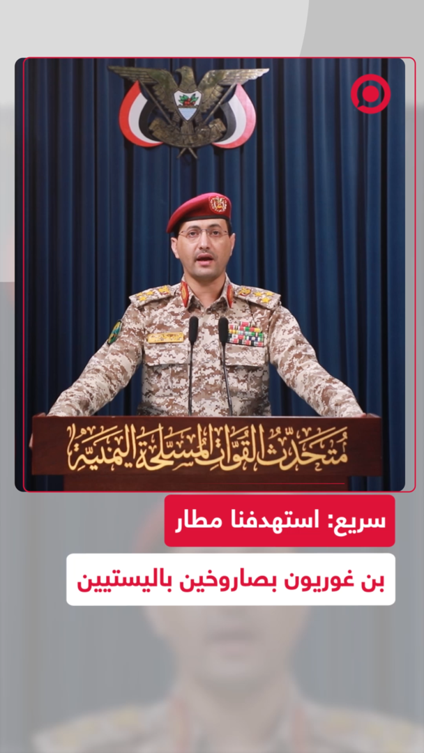 المتحدث العسكري باسم "الحوثيين" العميد يحيى سريع يعلن استهداف مطار بن غوريون الإسرائيلي بصاروخين باليستيين.