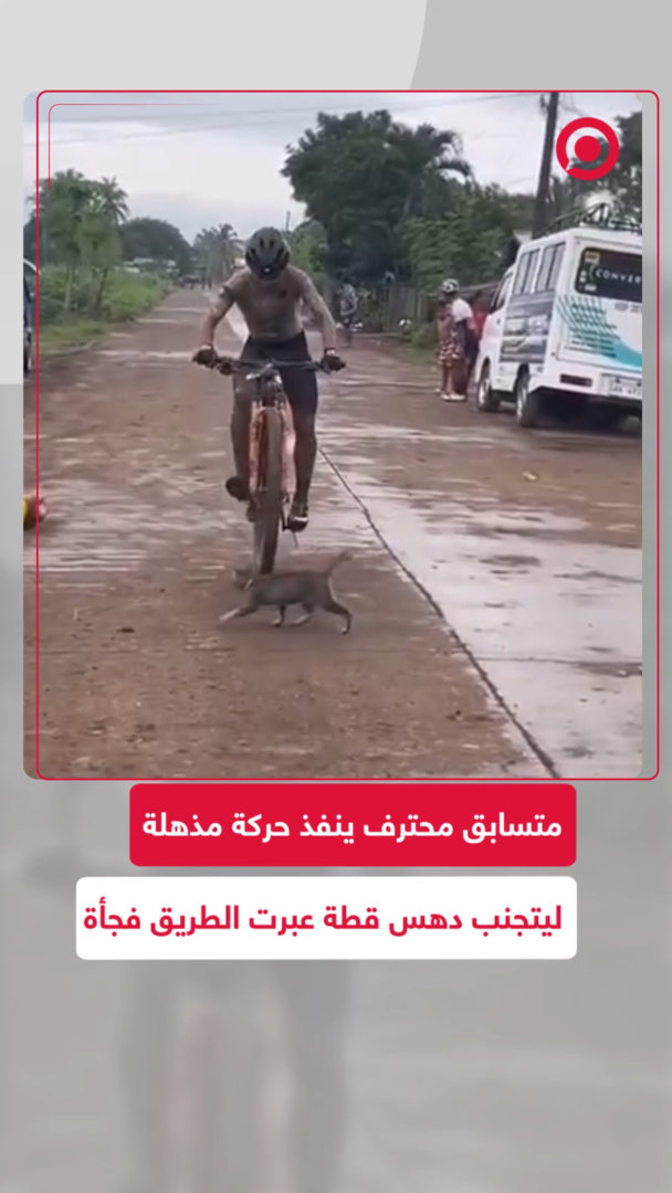 عبرت الطريق بشكل مفاجئ.. متسابق محترف ينفذ حركة قفز بهلوانية بدراجته تجنبا لدهس قطة كانت تعبر الطريق أمامه.