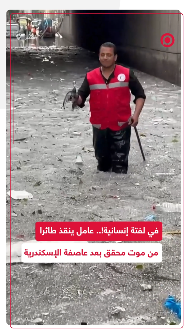 في أعقاب العاصفة التي ضربت مدينة الإسكندرية بمصر، تداول رواد مواقع التواصل الاجتماعي مقطع فيديو يُظهر عاملا يقوم بإنقاذ طائر صغير كان عالقا في إحدى برك المياه الناتجة عن الأمطار الغزيرة.