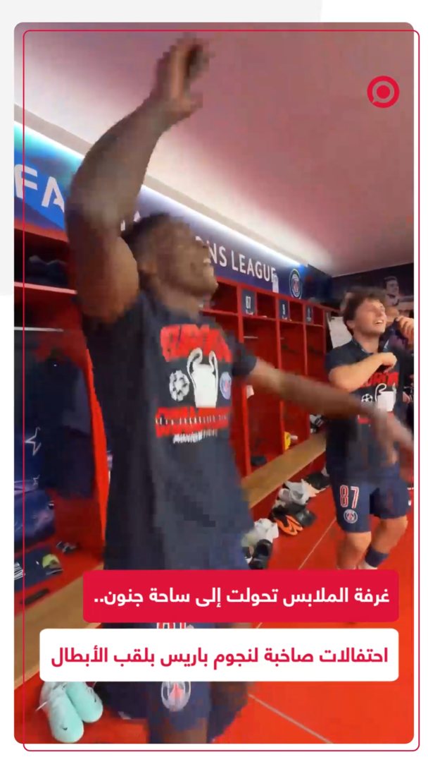 لحظات متفرقة من احتفالات لاعبي فريق باريس سان جيرمان بعد تتويجهم التاريخي بلقب دوري أبطال أوروبا لأول مرة في تاريخ النادي، وسط أجواء حماسية داخل غرفة الملابس وفي الملعب.