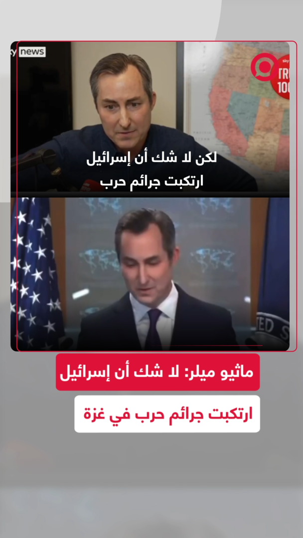 اعترف بأنه كان كاذبا.. المتحدث السابق باسم وزارة الخارجية الأمريكية، ماثيو ميلر، يرى أن إسرائيل ارتكبت جرائم حرب في غزة، ولكنه لم يستطع قول ذلك سابقا لأنه كان يتحدث حينها بلسان الحكومة الأمريكية وليس بلسانه.
