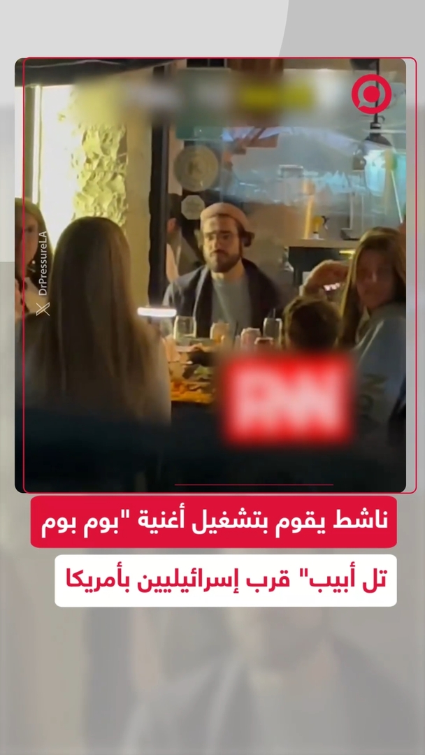 شاب مؤيد لفلسطين يثير الجدل بتشيغله أغنية "بوم بوم تل أبيب" قرب مجموعة من السياح الإسرائيليين، أثناء تناولهم العشاء في أحد المطاعم بالولايات المتحدة.