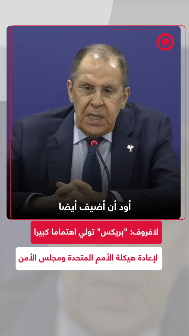 وزير الخارجية الروسي يؤكد أن مجموعة "بريكس" تولي اهتماما كبيرا لإعادة هيكلة المؤسسات العالمية مثل الأمم المتحدة ومجلس الأمن والبنك الدولي لتشمل تمثيل أكبر لدول إفريقيا وآسيا وأمريكا اللاتينية، نظرا لأن الغرب حصل على مقاعد أكثر مما يستحق من وجهة نظر تعادل القوى الفعلي على الساحة الدولية.