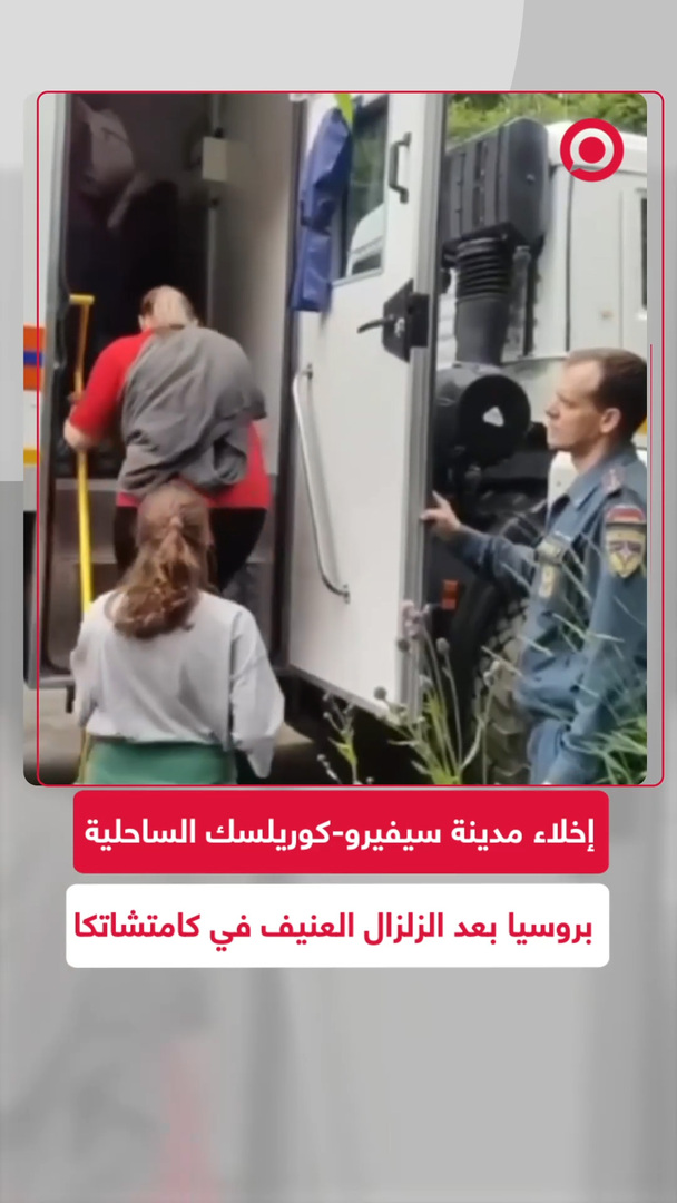 فرق الطوارئ الروسية تجلي سكان مدينة سيفيرو-كوريلسك والمناطق الساحلية في إقليم كامتشاتكا شرق روسيا بعد موجات تسونامي ضربت المنطقة عقب زلزال قوي.