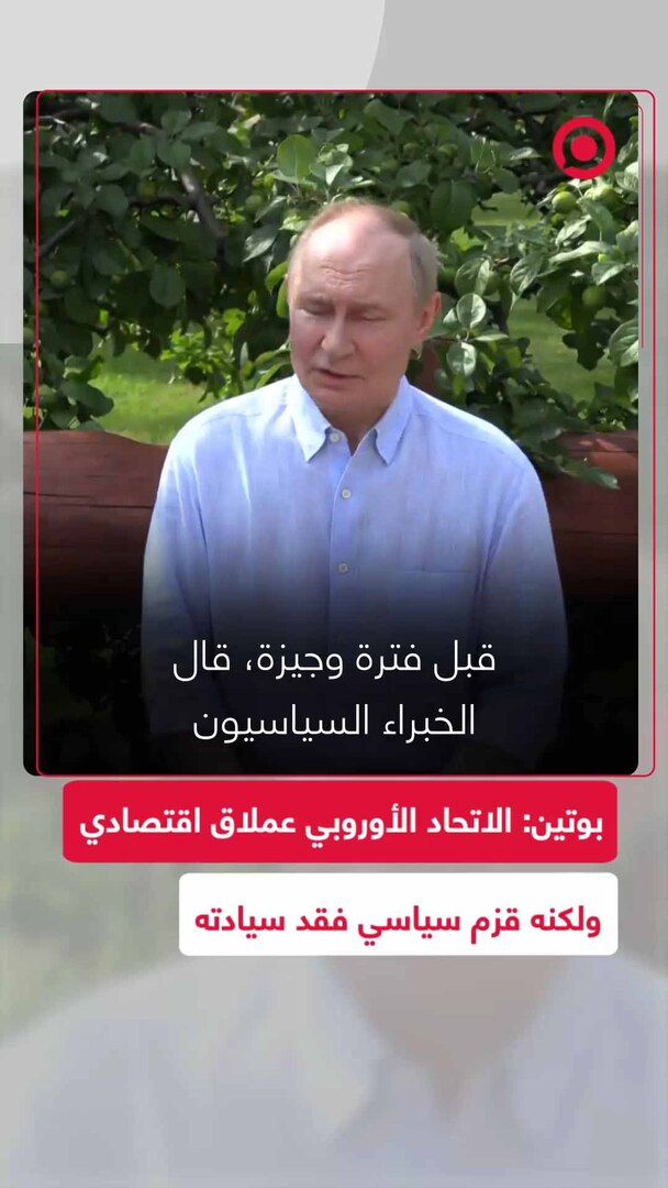 "الاتحاد الأوروبي عملاق اقتصادي ولكنه قزم سياسي فقد سيادته".. الرئيس الروسي فلاديمير بوتين يقول إن الاتحاد الأوروبي فقد سيادته اليوم وهذا ما سيكلفه تبعات سياسية واقتصادية، مشيرا إلى أن هذا ما تؤكده المصادر والأوساط السياسية الغربية