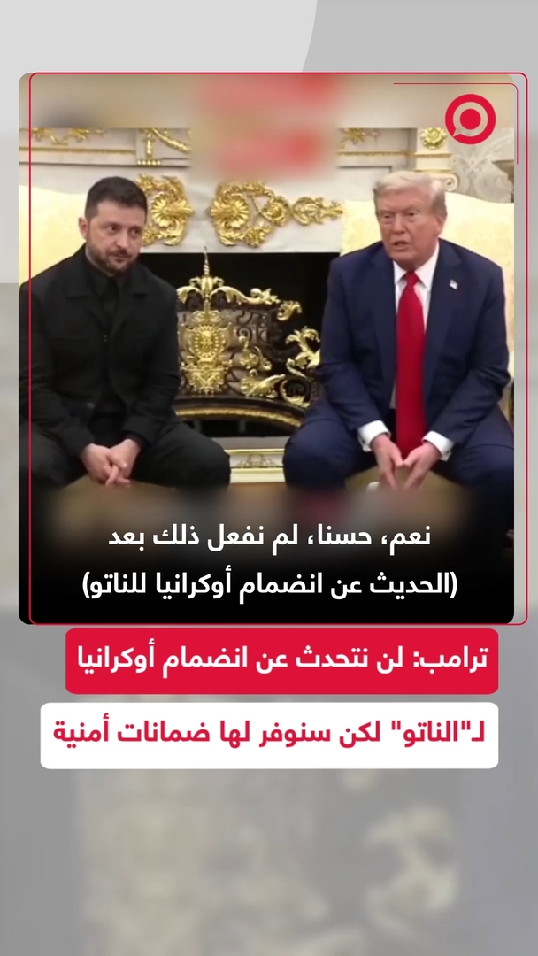 الرئيس الأمريكي دونالد ترامب، خلال لقائه زيلينسكي يؤكد أنه لم يتحدث عن انضمام أوكرانيا إلى "الناتو"، مشيرا إلى أن "واشنطن ستكتفي بتوفير ضمانات أمنية قوية لكييف".