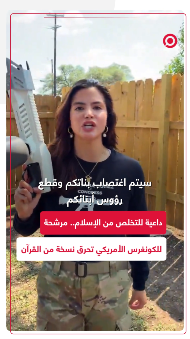 "فليذهب هؤلاء الإرهابيون المسلمون إلى أي من الدول الإسلامية الـ 57".. فالنتينا غوميز المرشحة الجمهورية للكونغرس الأمريكي تظهر في فيديو وهي تحرق نسخة من القرآن الكريم داعية لطرد المسلمين الذين دعتهم بـ"الإرهابيين" من الولايات المتحدة.