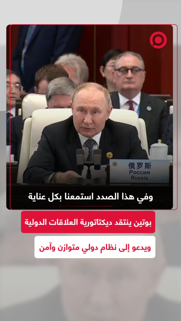 في كلمة خلال قمة منظمة شانغهاي للتعاون.. الرئيس الروسي فلاديمير بوتين، يؤكد دعمه الكامل للمبادرة التي طرحها الرئيس الصيني شي جين بينغ، لإنشاء نظام إدارة عالمي أكثر كفاءة وعدالة، كما انتقد رغبة بعض الدول في السعي إلى الدكتاتورية في العلاقات الدولية، مشددا على ضرورة بناء نظام متوازن قائم على سيادة القانون الدولي وميثاق الأمم المتحدة.