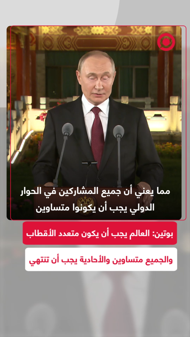 "العالم يجب أن يكون متعدد الأقطاب والجميع متساوين ولا ينبغي أن يوجد طرف أكثر مساواة من الآخرين".. الرئيس الروسي فلاديمير بوتين، يؤكد من الصين أن العالم أحادي القطب يجب أن ينتهي لمصلحة الجميع ومصلحة شعوب تلك الحكومات التي لا تزال تعتاش على أساس النظام أحادي القطب