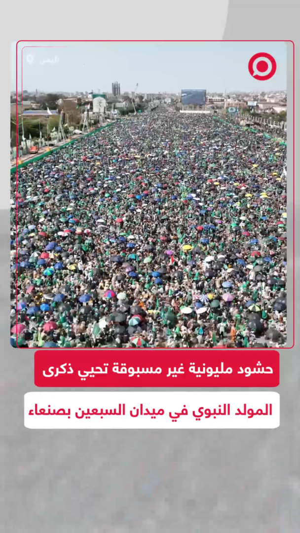 ميدان السبعين في العاصمة اليمنية صنعاء يشهد توافد حشود مليونية هائلة وغير مسبوقة للمشاركة في إحياء ذكرى المولد النبوي الشريف، في مشهد احتفالي بالمناسبة الدينية.