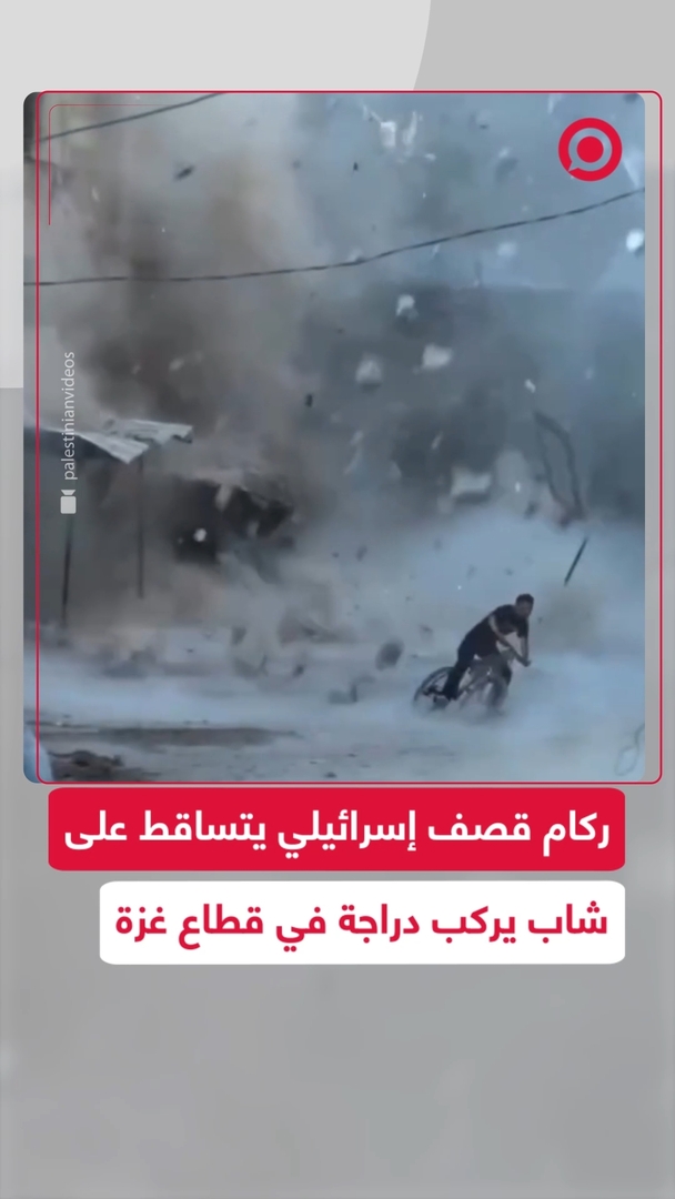 لحظات مرعبة تحت القصف.. شاب فلسطيني يمر بدراجته الهوائية خلال غارة إسرائيلية، لتتساقط الحجارة فوقه فجأة وسط الشارع، في مشهد يلخص حياة الغزيين ومعاناتهم تحت الخطر والتهديد اليومي. #ركام #قصف #دراجة #ريل #فيديو #viral #اكسبلور