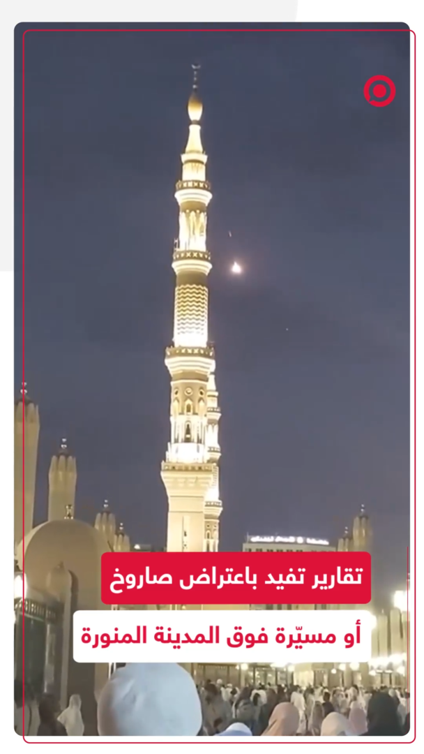 مشاهد مصوّرة من المدينة المنورة تُظهر دوي انفجار قوي وتحليق جسم مجهول فوق المسجد النبوي الشريف. ووفقا للتقارير، يُرجّح أن الحادث ناتج عن اعتراض صاروخ أو مسيّرة أطلقها الحوثيون من الأراضي اليمنية في اتجاه إسرائيل.