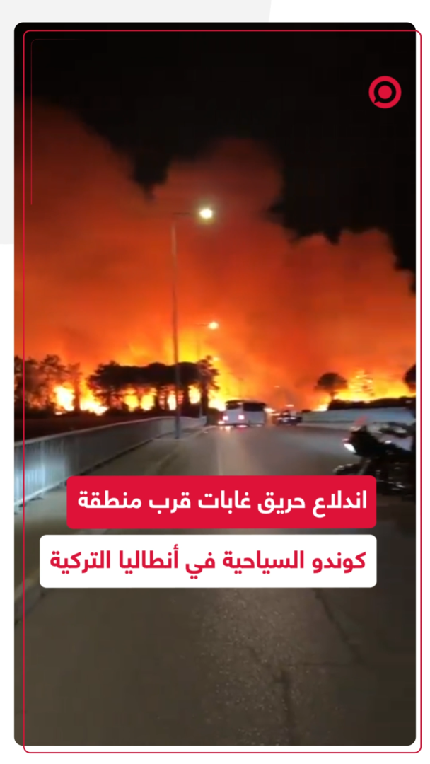 مشاهد متداولة على مواقع التواصل الاجتماعي لألسنة النار المتصاعدة إثر اندلاع حريق غابات في منطقة كوندو القريبة من مدينة أنطاليا التركية، التي تضم عددا من الفنادق السياحية الشهيرة. #حريق #تركيا #كوندو #فيديو