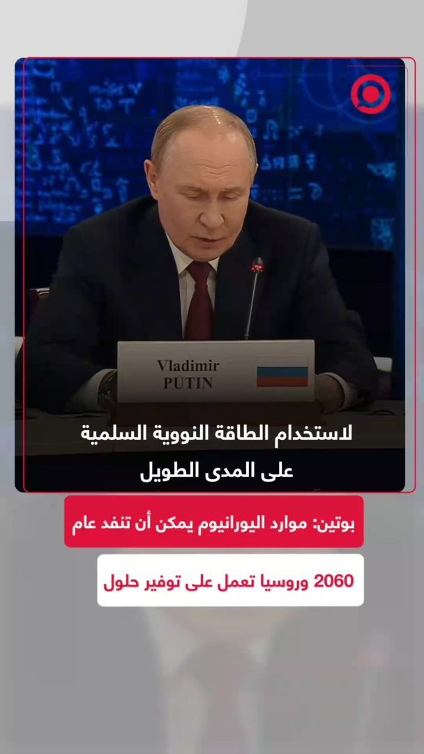 "حسب السيناريو المتفائل سينفد اليورانيوم عام 2090، ويمكن أن يحدث هذا عام 2060 أمام أعيننا".. الرئيس الروسي فلاديمير بوتين يؤكد أن روسيا تبحث عن حلول لتفادي مشكلة نفاد موارد اليورانيوم.