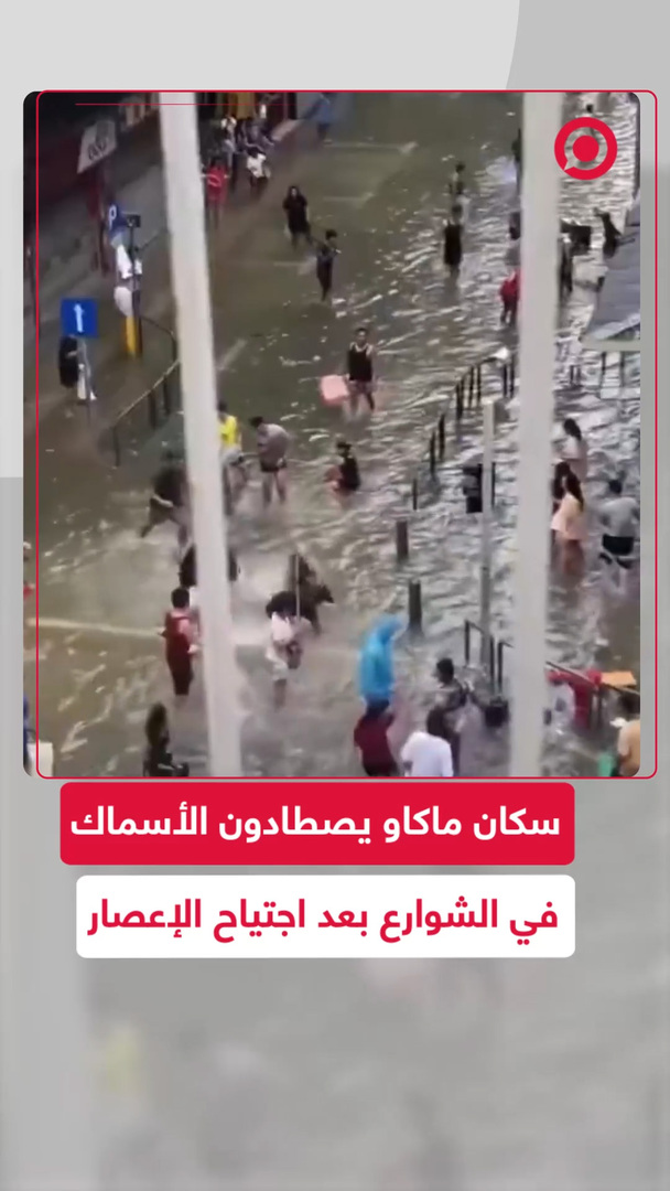 مشهد غير معتاد في ماكاو.. الأسماك تخرج وسط الشوارع بعد الفيضان والناس يصطادونها بسهولة. #ماكاو #إعصار #فيضانات #أسماك_في_الشوارع #صيد_الأسماك #فيديو
