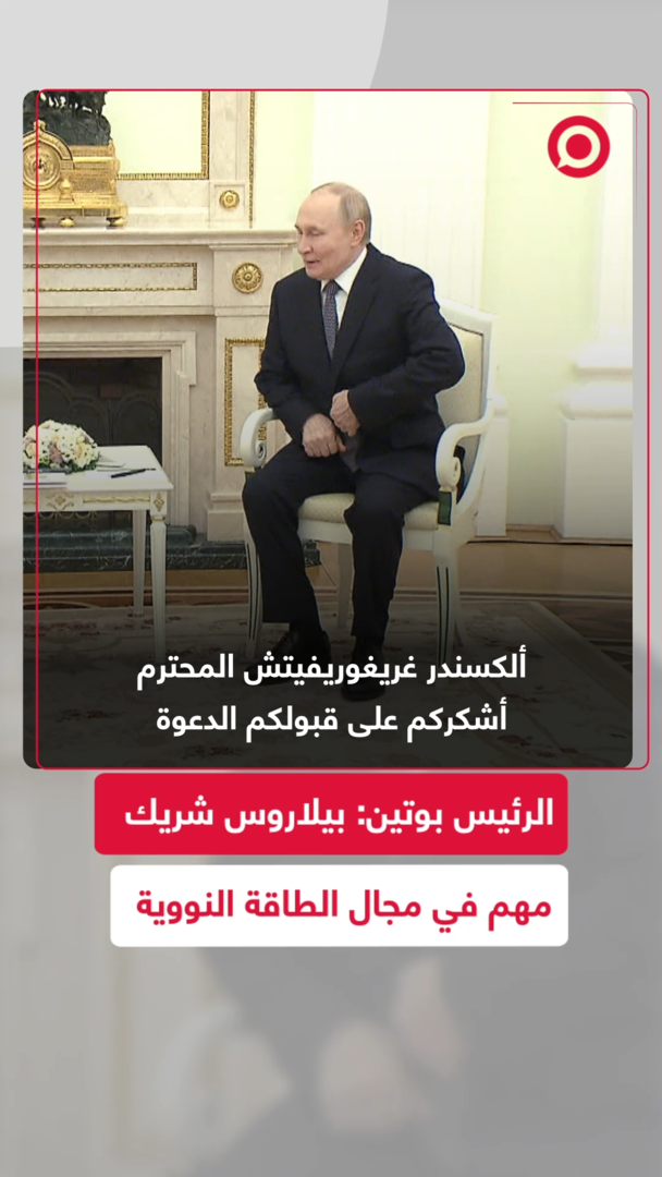 خلال استقبال الرئيس البيلاروسي ألكسندر لوكاشينكو في موسكو للمشاركة في الفعاليات بمناسبة الذكرى الـ80 لتأسيس مجال الطاقة النووية في روسيا، الرئيس الروسي فلاديمير بوتين، يشيد بالشراكة الاستراتيجية بين البلدين في هذا المجال الحيوي، ويؤكد على أهمية بيلاروس كشريك مهم لروسيا في مجال الطاقة النووية.