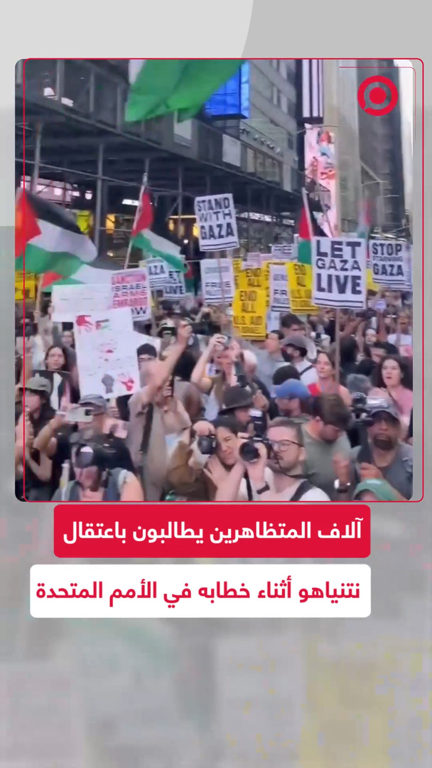 متظاهرون بالآلاف يحتشدون أمام مقر الأمم المتحدة في نيويورك، مرددين شعارات تطالب باعتقال نتنياهو أثناء إلقائه كلمته أمام الجمعية العامة. #نتنياهو #الأمم_المتحدة #احتجاجات #مطالبة_بالاعتقال #فيديو