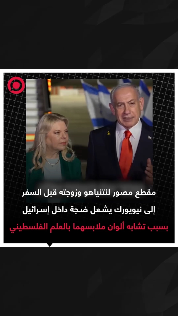 مقطع مصور لرئيس الوزراء الإسرائيلي بنيامين نتنياهو وزوجته سارة قبيل سفرهما إلى نيويورك للمشاركة في اجتماعات الجمعية العامة للأمم المتحدة، أثار ضجة واسعة داخل إسرائيل، بعد أن لاحظ ناشطون أن ألوان ملابسهما تطابق ألوان العلم الفلسطيني.