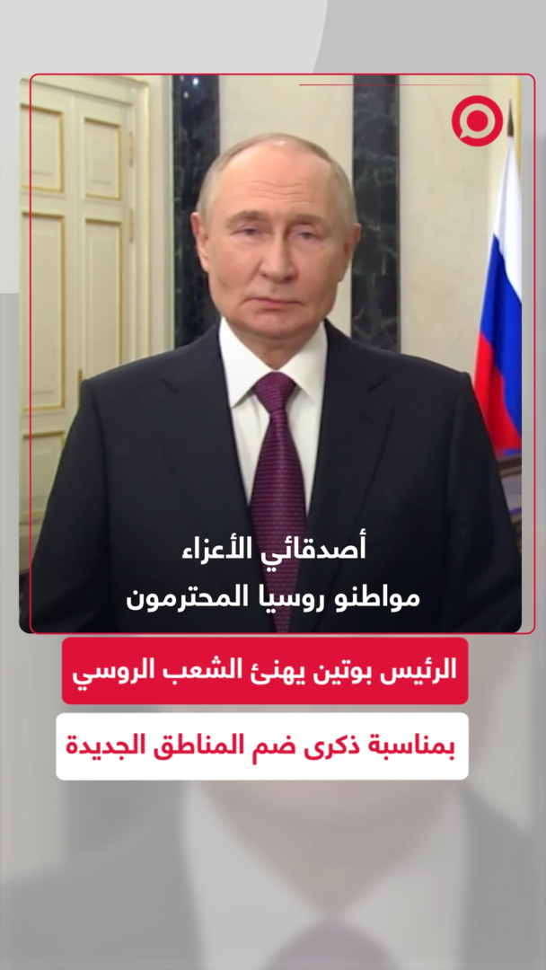 الرئيس الروسي فلاديمير بوتين، يهنئ الشعب الروسي بمناسبة الذكرى الثالثة لضم المناطق الجديدة "لوغانسك، دونيتسك، خيرسون، زابوروجيه" مع الوطن الأم روسيا، مشيرا إلى أن هذا الحدث يؤكد التكاتف القوي بين مختلف المناطق الروسية التي تساند بعضها للدفاع عن الوطن.