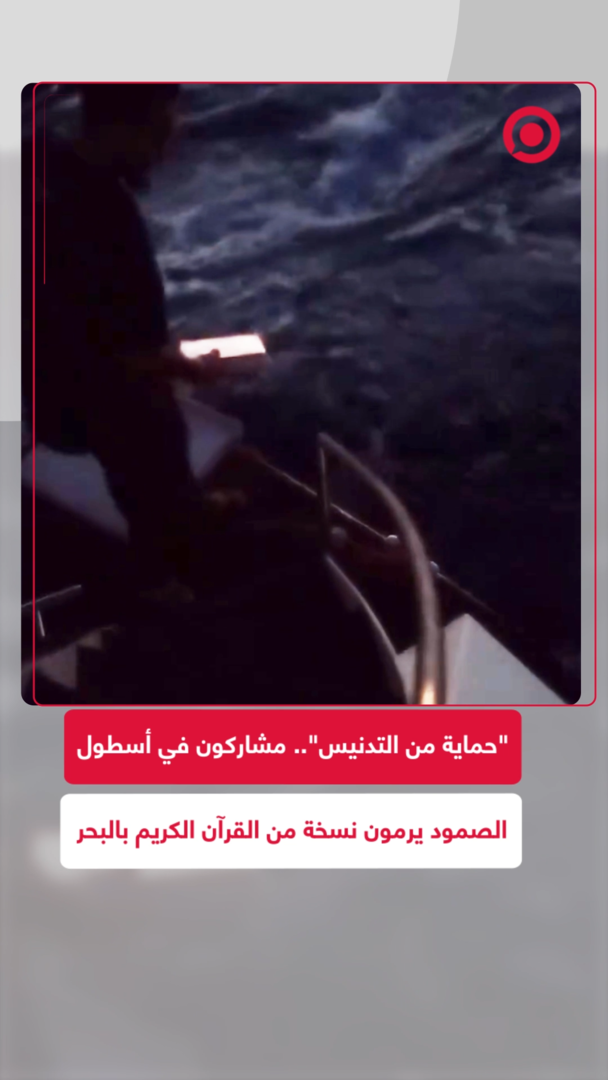 مقطع فيديو متداول من أحد مراكب أسطول الصمود يظهر لحظة إلقاء نسخة من القرآن الكريم في البحر لـ"حمايتها من التدنيس". #اسطول_الصمود #فيديو #مصحف #قرآن #فيديو