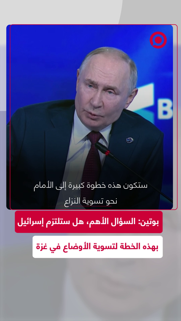 "مرة ثالثة أكرر، إقامة الدولية الفلسطينية هو العامل الرئيسي للتسوية بشكل عام".. الرئيس الروسي يتحدث عن خطة ترامب لتسوية الأوضاع في غزة مؤكدا أن السؤال الأهم إذا كانت إسرائيل ستلتزم بهذه الخطة.