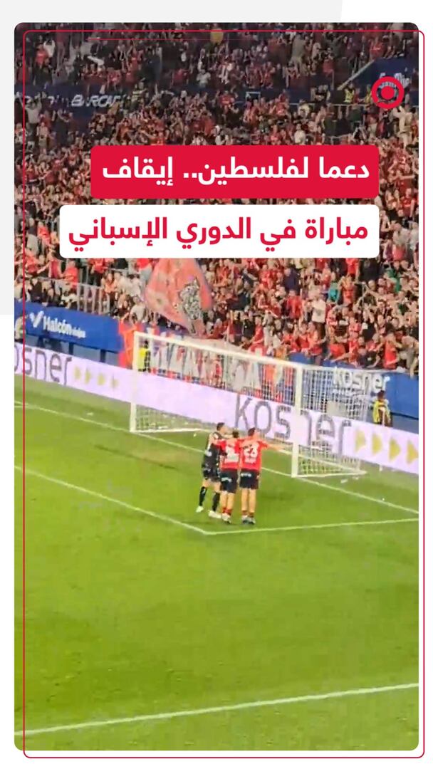 "هيا بنا يا فلسطين".. إيقاف مباراة في الدوري الإسباني لعدة دقائق، حيث نظمت جماهير نادي أوساسونا وقفة احتجاجية تضامنية مع القضية الفلسطينية معبرة عن رفضها للاعتداءات المستمرة التي تشنها إسرائيل والحصار المفروض على القطاع #غزة #رياضة #الدوري_الإسباني #فلسطين #إسرائيل