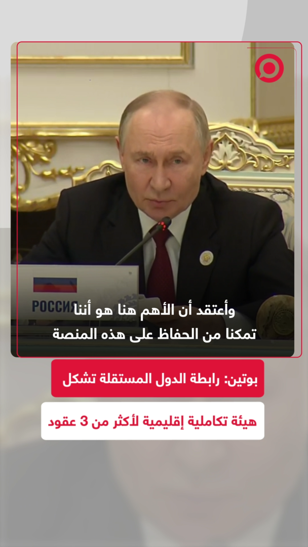 الرئيس الروسي فلاديمير بوتين خلال كلمته أمام قادة رابطة الدول المستقلة، يشيد بالجهود المبذولة من قبل الرابطة، ويؤكد على أهمية المحافظة على هذه المنصة واستخدامها لرفع مستوى العلاقات بين الدول الاعضاء.