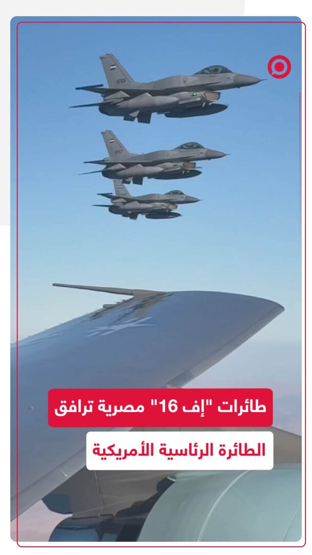 مشاهد للحظة مرافقة طائرات "إف 16" المصرية للطائرة الرئاسية الأمريكية المتجهة إلى شرم الشيخ عقب دخولها المجال الجوي المصري. #مصر #ترامب #فلسطين #غزة