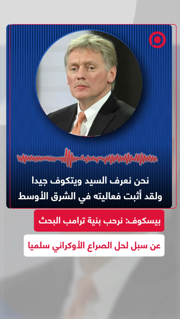 "ويتكوف أثبت فعاليته بالشرق الأوسط ونتطلع إلى رؤية نجاحاته على المحور الأوكراني".. المتحدث باسم الكرملين دميتري بيسكوف، يرحب بقرار الرئيس الأمريكي دونالد ترامب بتكليف مبعوثه الخاص ستيف ويتكوف بالتركيز على تسوية النزاع الأوكراني.