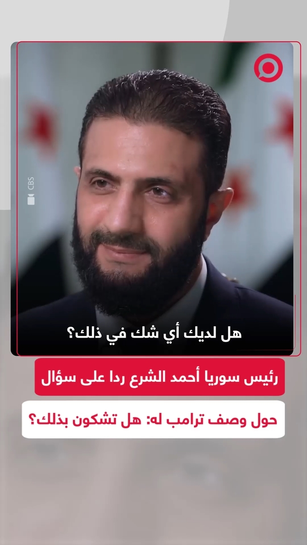 إجابة عفوية لاقت تفاعلا واسعا.. في مقابلة على شبكة "CBS"، فاجأ الرئيس السوري أحمد الشرع المذيعة الأمريكية مارغريت برينان بإجابة غير متوقعة عندما سألته عن وصف الرئيس الأمريكي دونالد ترامب له. #الشرع #مقابلة #مذيعة #ترند #فيديو #viral #اكسبلور