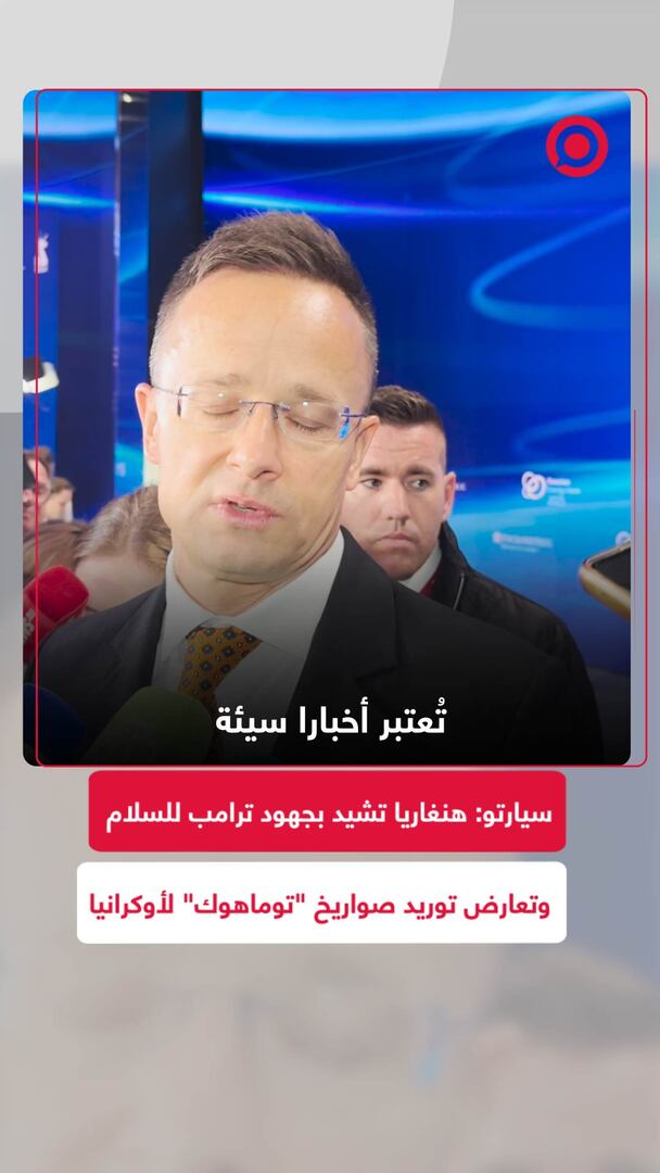 "بودابست ترفض أي خطوات تزيد حدة الصراع الأوكراني وتعارض توريد صواريخ "توماهوك" لأوكرانيا".. وزير الخارجية الهنغاري بيتر سيارتو، يعرب عن امتنان بلاده للجهود التي بذلها الرئيس الأمريكي دونالد ترامب لإحلال السلام في المنطقة، معتبرا أن المقارنة بين دور الإدارة الأمريكية السابقة والحالية تجاه أوكرانيا تظهر بوضوح عبر جهود ترامب للسلام.