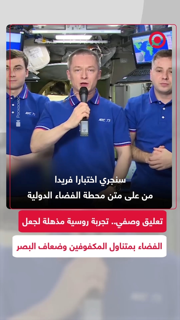 في 15 أكتوبر وبمناسبة اليوم العالمي للعصا البيضاء، نفّذ رواد الفضاء الروس سيرغي ريجيكوف وأليكسي زوبريتسكي وأوليغ بلاتونوف تجربة فريدة من نوعها عبر تقديم "تيفلو" تعليق (وصف سمعي) من على متن محطة الفضاء الدولية لجعل المشاهد الفضائية في المتناول بالنسبة للمكفوفين وضعاف البصر. #روسيا #فضاء #محطة_الفضاء #ريل #فيديو #viral #اكسبلور