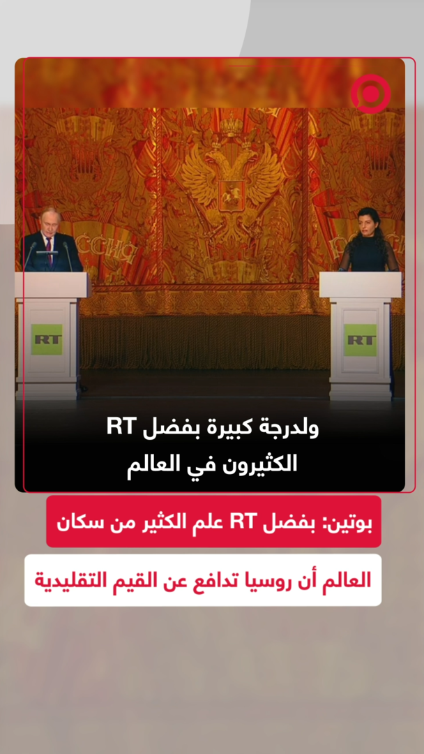 "بعض مواطني أوروبا والولايات المتحدة يحاولون التصدي لعدم المساواة الاجتماعية وتدمير العائلة والتعدي على براءة الأطفال وقد وجدوا في RT ضالتهم".. الرئيس الروسي فلاديمير بوتين يؤكد أنه بفضل قناة RT علم الكثير من سكان العالم أن روسيا تدافع عن القيم التقليدية #بوتين #روسيا #RT